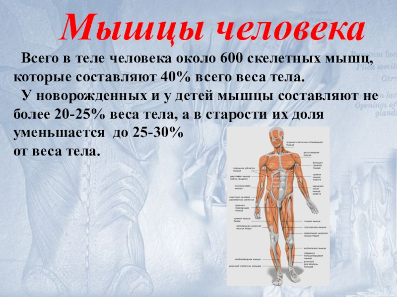 У новорожденных и у детей мышцы составляют не более 20-25% веса тела, а в старости их доля уменьшается до 25-30%