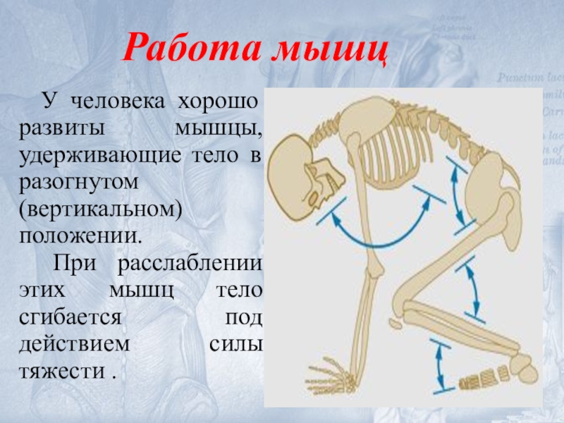 Слайд 40 У человека хорошо развиты мышцы, удерживающие тело в разогнутом (вертикальном)