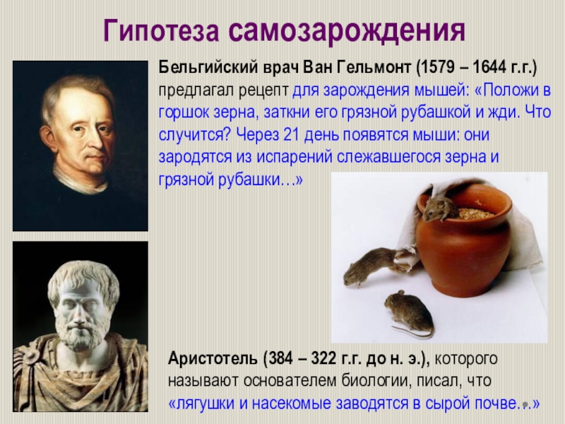 Аристотель (384 – 322 г.г. до н. э.), которого называют основателем биологии, писал, что «лягушки и насекомые заводятся в сырой почве…»