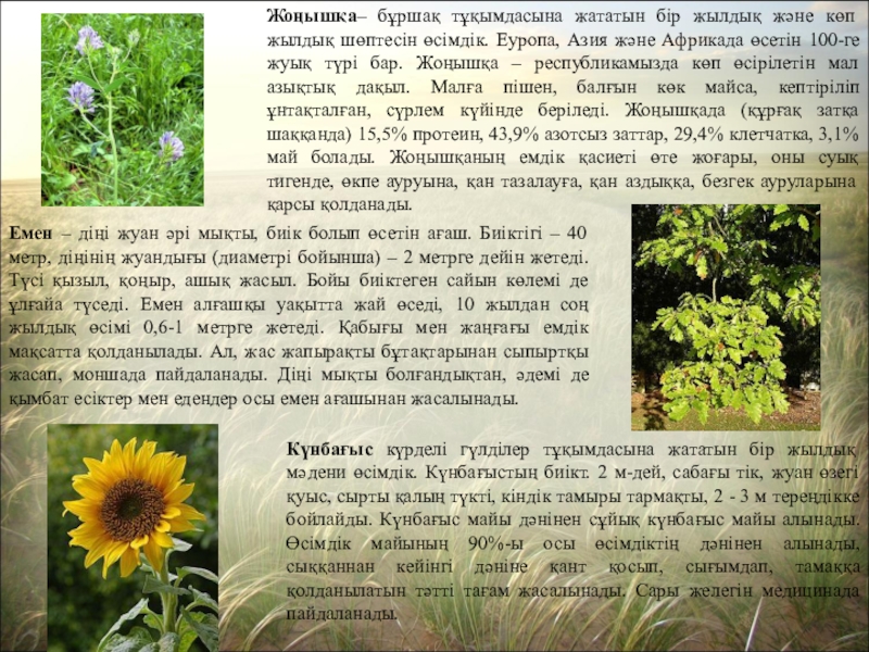 Емен – діңі жуан әрі мықты, биік болып өсетін ағаш. Биіктігі – 40 метр, діңінің жуандығы (диаметрі бойынша) – 2 метрге дейін жетеді.Түсі қызыл, қоңыр, ашық жасыл. Бойы биіктеген сайын көлемі де ұлғайа түседі. Емен алғашқы уақытта жай өседі, 10 жылдан соң жылдық өсімі 0,6-1 метрге жетеді. Қабығы мен жаңғағы емдік мақсатта қолданылады. Ал, жас жапырақты бұтақтарынан сыпыртқы жасап, моншада пайдаланады. Діңі мықты болғандықтан, әдемі де қымбат есіктер мен едендер осы емен ағашынан жасалынады.