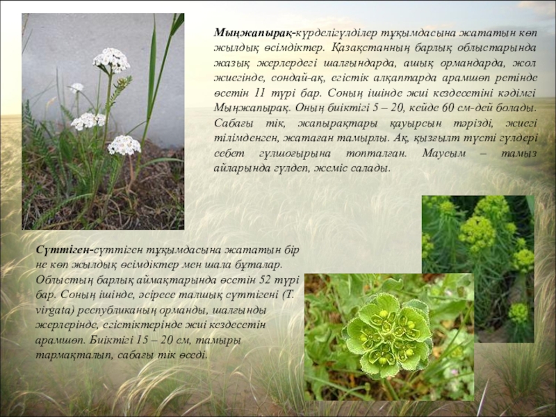 Сүттіген-сүттіген тұқымдасына жататын бір не көп жылдық өсімдіктер мен шала бұталар. Облыстың барлық аймақтарында өсетін 52 түрі бар. Соның ішінде, әсіресе талшық сүттігені (Т. vіrgata) республиканың орманды, шалғынды жерлерінде, егістіктерінде жиі кездесетін арамшөп. Биіктігі 15 – 20 см, тамыры тармақталып, сабағы тік өседі.