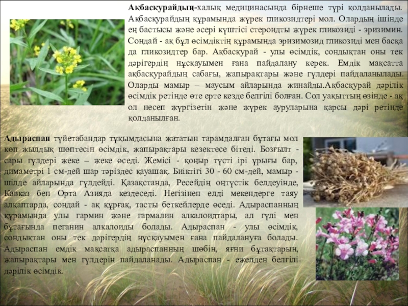 Адыраспан түйетабандар тұқымдасына жататын тарамдалған бұтағы мол көп жылдық шөптесін өсімдік, жапырақтары кезектесе бітеді. Бозғылт - сары гүлдері жеке – жеке өседі. Жемісі - қоңыр түсті ірі ұрығы бар, димаметрі 1 см-дей шар тәріздес қауашақ. Биіктігі 30 - 60 см-дей, мамыр - шілде айларында гүлдейді. Қазақстанда, Ресейдің оңтүстік белдеуінде, Кавказ бен Орта Азияда кездеседі. Негізінен елді мекендерге таяу алқаптарда, сондай - ақ құрғақ, тасты беткейлерде өседі. Адыраспанның құрамында улы гармин және гармалин алкалоидтары, ал гүлі мен бұтағында пеганин алкалоиды болады. Адыраспан - улы өсімдік, сондықтан оны тек дәрігердің нұсқауымен ғана пайдалануға болады. Адыраспан емдік мақсатқа адыраспанның шөбін, яғни бұтақтарын, жапырақтары мен гүлдерін пайдаланады. Адыраспан - ежелден белгілі дәрілік өсімдік.
