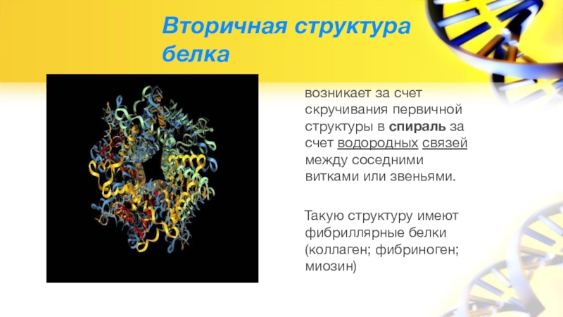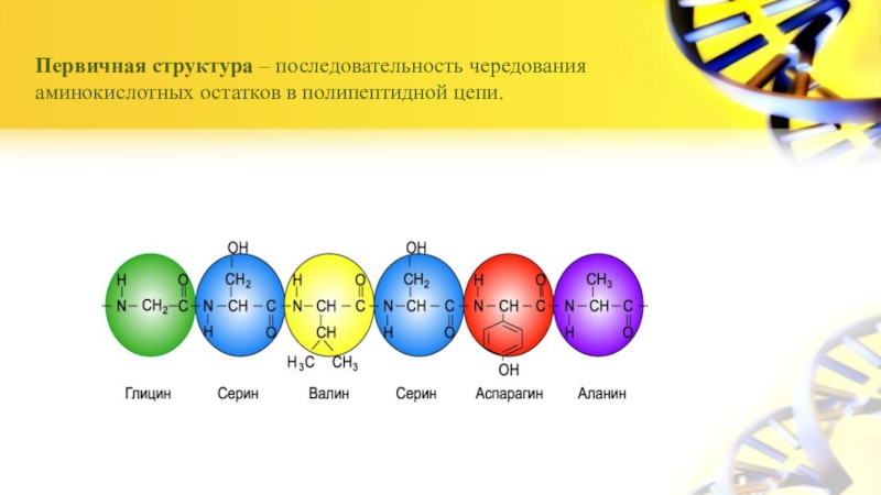 Слайд 7Первичная структура – последовательность чередования аминокислотных остатков в полипептидной цепи.