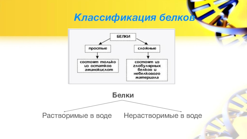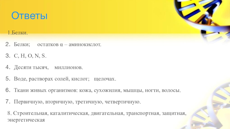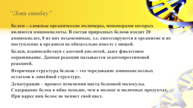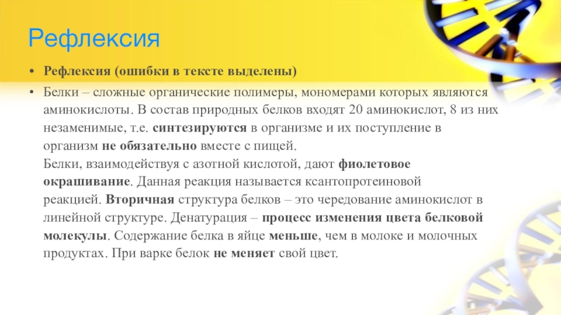 Белки, взаимодействуя с азотной кислотой, дают фиолетовое окрашивание. Данная реакция называется ксантопротеиновой реакцией. Вторичная структура белков – это чередование аминокислот в линейной структуре. Денатурация – процесс изменения цвета белковой молекулы. Содержание белка в яйце меньше, чем в молоке и молочных продуктах. При варке белок не меняет свой цвет.