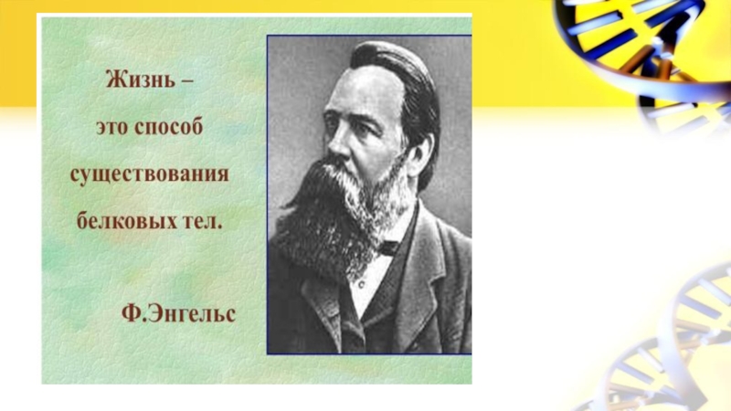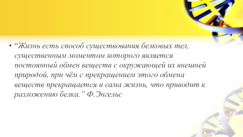 Слайд 3“Жизнь есть способ существования белковых тел, существенным моментом которого является постоянный