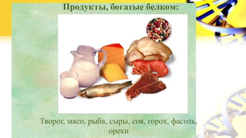 Творог, мясо, рыба, сыры, соя, горох, фасоль, орехи