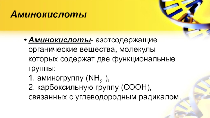 Аминокислоты- азотсодержащие органические вещества, молекулы которых содержат две функциональные группы: