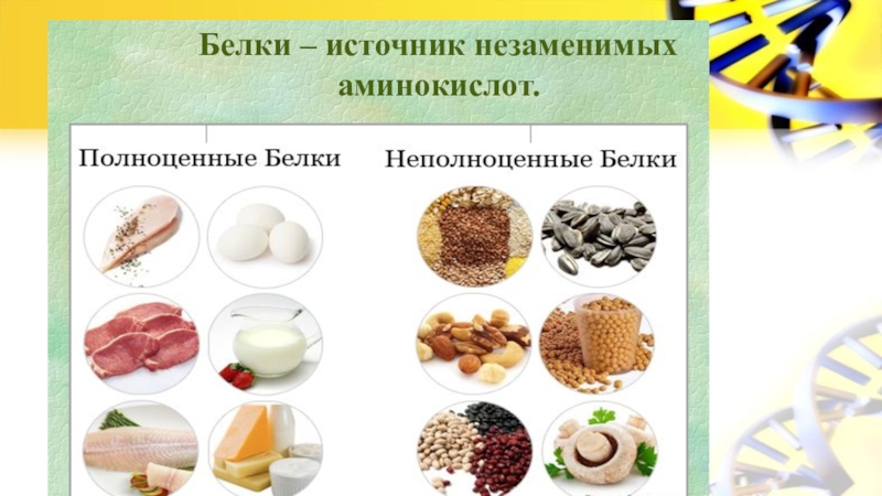 которых являются аминокислоты. В состав природных белков входят 20 аминокислот, 8 из них незаменимые, т.е. синтезируются в организме и их поступление в организм не обязательно вместе с пищей.