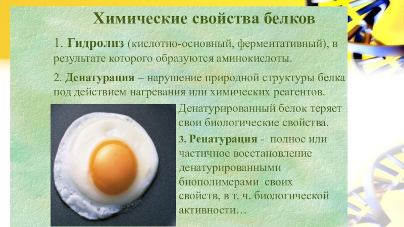 Денатурация – процесс изменения цвета белковой молекулы. Содержание белка в яйце меньше, чем в молоке и молочных продуктах. При варке яиц белок не меняет свой цвет.