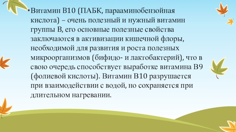 нужный витамин группы B, его основные полезные свойства заключаются в активизации кишечной флоры, необходимой для развития и роста полезных микроорганизмов (бифидо- и лактобактерий), что в свою очередь способствует выработке витамина В9 (фолиевой кислоты). Витамин В10 разрушается при взаимодействии с водой, но сохраняется при длительном нагревании.