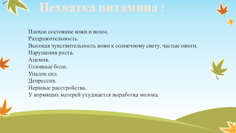 Нехватка витамина :Плохое состояние кожи и волос.Раздражительность.Высокая чувствительность кожи к солнечному свету, частые ожоги.Нарушения роста.Анемия.Головные боли.Упадок сил.Депрессия.Нервные