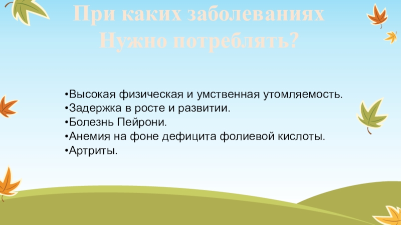 При каких заболеванияхНужно потреблять?Высокая физическая и умственная утомляемость. Задержка в росте и развитии. Болезнь Пейрони. Анемия на