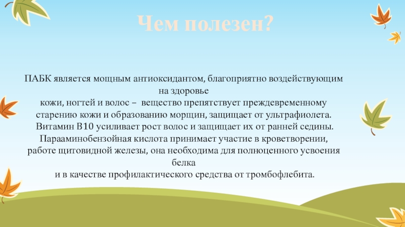 Чем полезен?ПАБК является мощным антиоксидантом, благоприятно воздействующим на здоровьекожи, ногтей и волос –  вещество препятствует преждевременному
