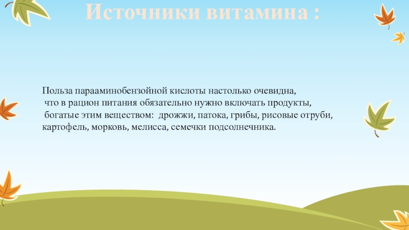 Источники витамина :Польза парааминобензойной кислоты настолько очевидна, что в рацион питания обязательно нужно включать продукты, богатые этим