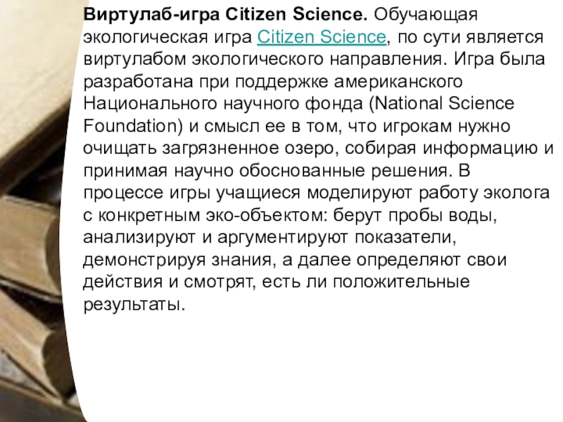 Слайд 39Виртулаб-игра Citizen Science. Обучающая экологическая игра Citizen Science, по сути является виртулабом экологического