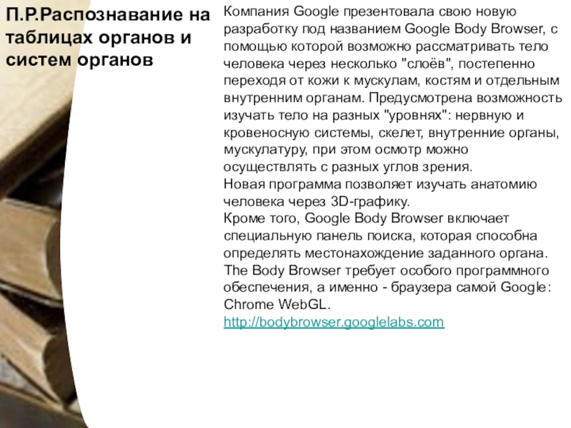 Слайд 23Компания Google презентовала свою новую разработку под названием Google Body Browser,