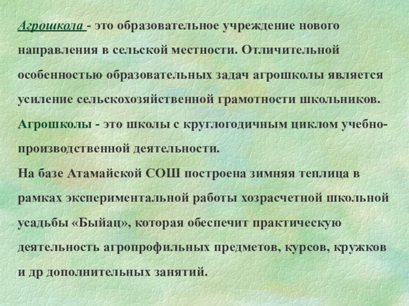 Слайд 3Агрошкола - это образовательное учреждение нового направления в сельской местности. Отличительной