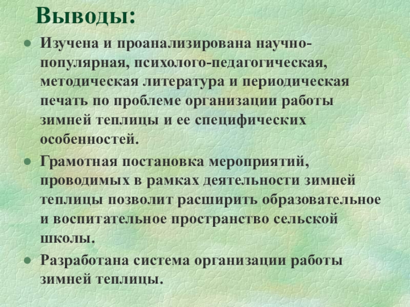 Грамотная постановка мероприятий, проводимых в рамках деятельности зимней теплицы позволит расширить образовательное и воспитательное пространство сельской школы.