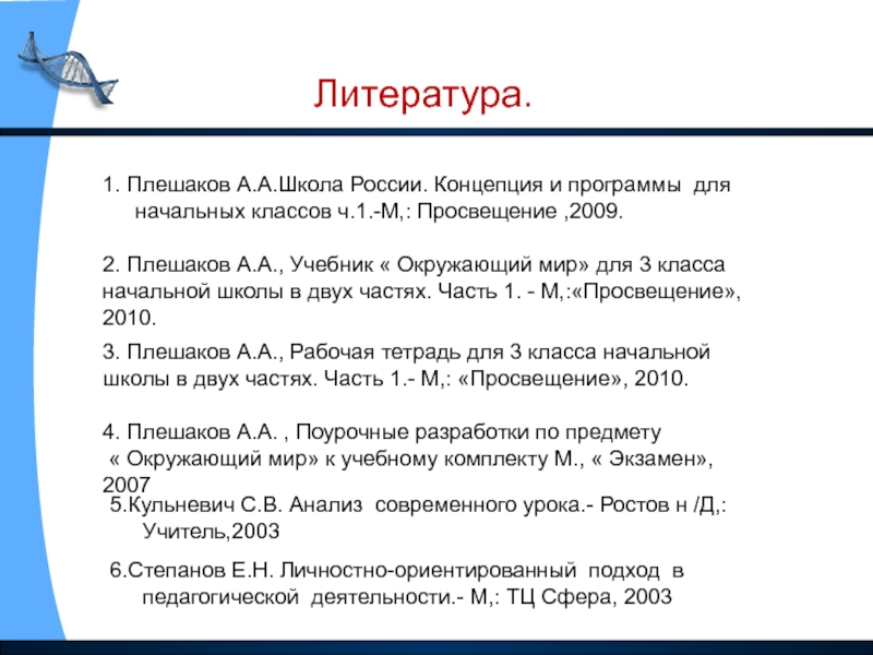 2. Плешаков А.А., Учебник « Окружающий мир» для 3 класса начальной школы в двух частях. Часть 1. - М,:«Просвещение», 2010.