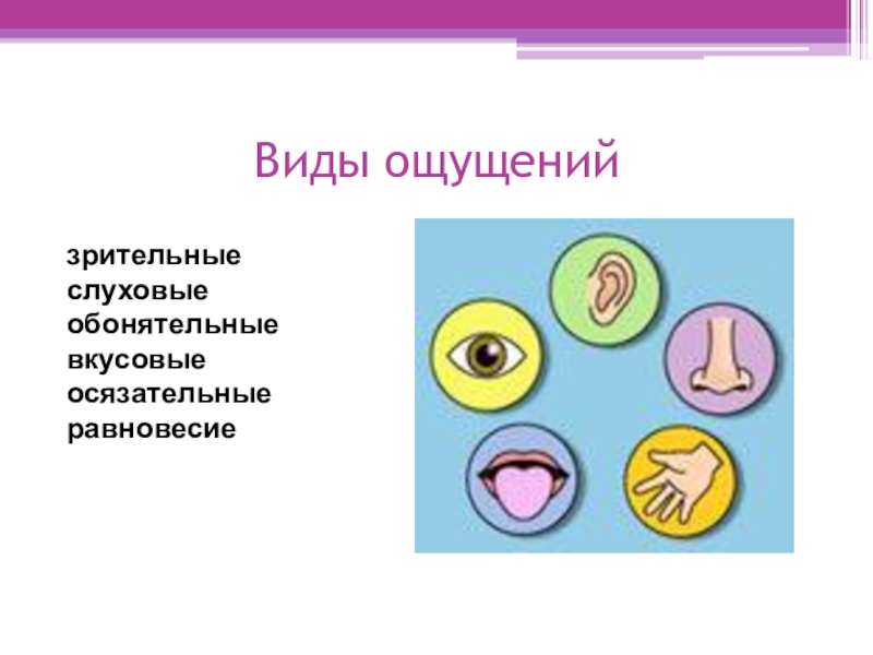 Виды ощущенийзрительные слуховые обонятельныевкусовые осязательныеравновесие