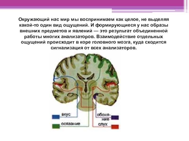 вид ощущений. И формирующиеся у нас образы внешних предметов и явлений — это результат объединенной работы многих анализаторов. Взаимодействие отдельных ощущений происходит в коре головного мозга, куда сходится сигнализация от всех анализаторов.