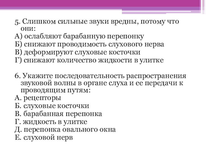 5. Слишком сильные звуки вредны, потому что они:А) ослабляют барабанную перепонкуБ) снижают проводимость слухового нерваВ) деформируют слуховые
