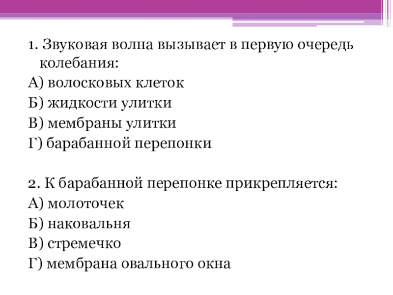1. Звуковая волна вызывает в первую очередь колебания:А) волосковых клетокБ) жидкости улиткиВ) мембраны улиткиГ) барабанной перепонки2. К барабанной перепонке прикрепляется:А) молоточекБ) наковальняВ) стремечкоГ) мембрана овального окна