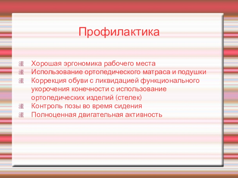 ПрофилактикаХорошая эргономика рабочего местаИспользование ортопедического матраса и подушкиКоррекция обуви с ликвидацией функционального укорочения конечности с использование ортопедических
