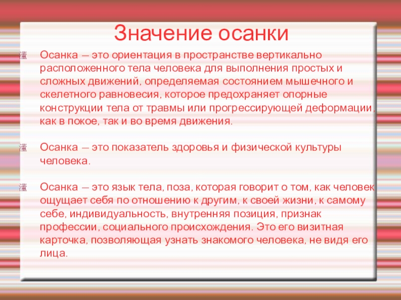Осанка — это язык тела, поза, которая говорит о том, как человек ощущает себя по отношению к другим, к своей жизни, к самому себе, индивидуальность, внутренняя позиция, признак профессии, социального происхождения. Это его визитная карточка, позволяющая узнать знакомого человека, не видя его лица.