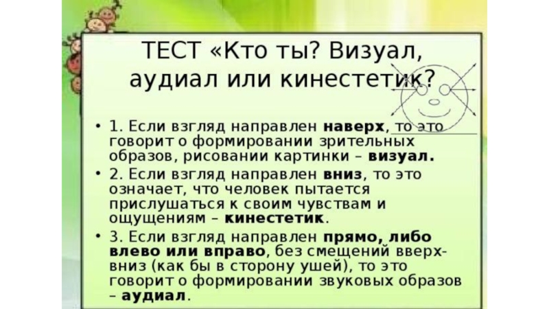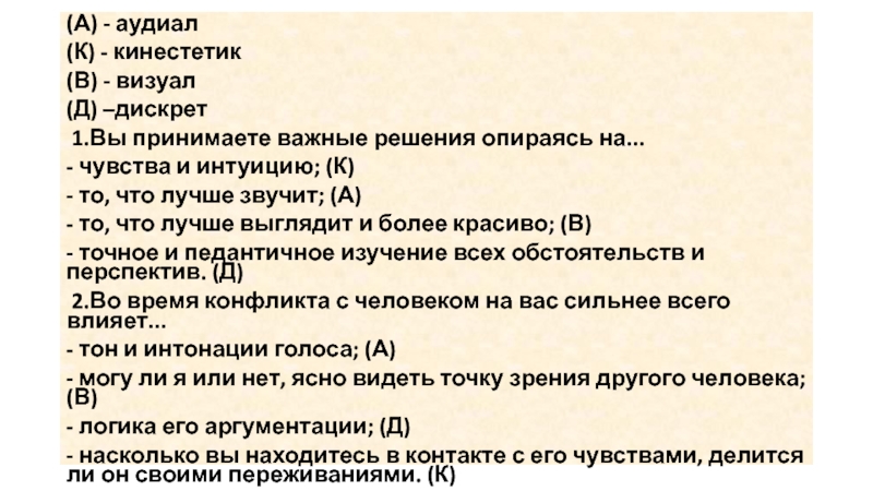 (А) - аудиал(К) - кинестетик(В) - визуал(Д) –дискрет 1.Вы принимаете важные решения опираясь на... - чувства и интуицию;