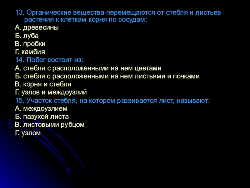 Слайд 3713. Органические вещества перемещаются от стебля и листьев растения к клеткам