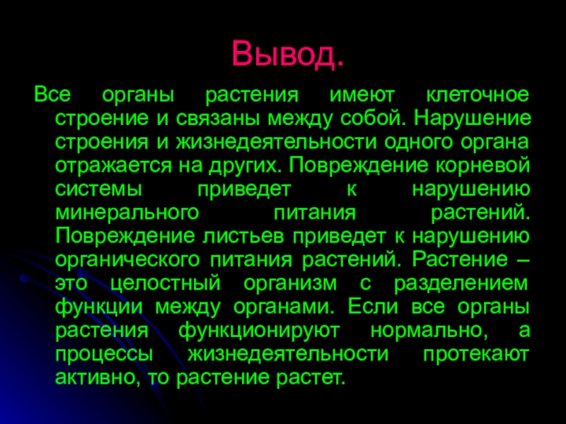 Нарушение строения и жизнедеятельности одного органа отражается на других. Повреждение корневой системы приведет к нарушению минерального питания растений. Повреждение листьев приведет к нарушению органического питания растений. Растение – это целостный организм с разделением функции между органами. Если все органы растения функционируют нормально, а процессы жизнедеятельности протекают активно, то растение растет.
