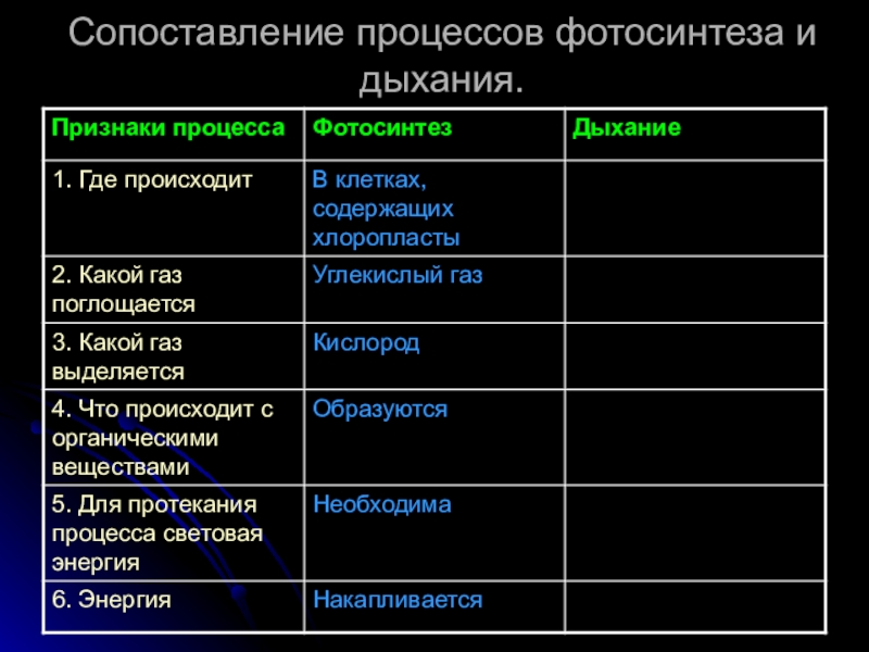 Слайд 19Сопоставление процессов фотосинтеза и дыхания.