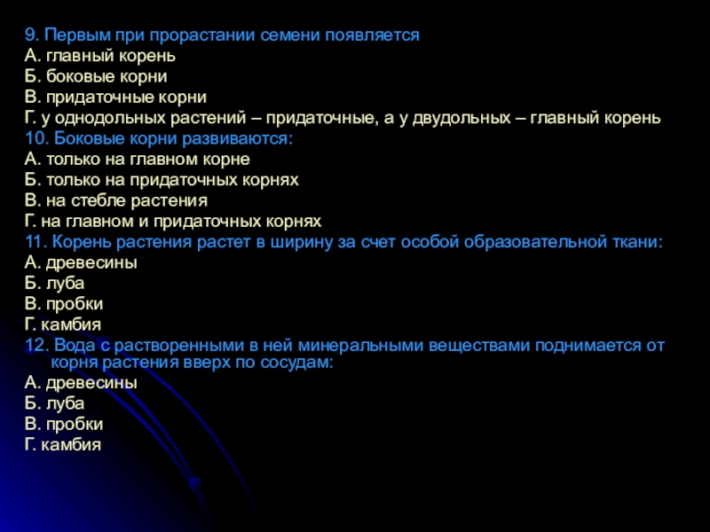 12. Вода с растворенными в ней минеральными веществами поднимается от корня растения вверх по сосудам: