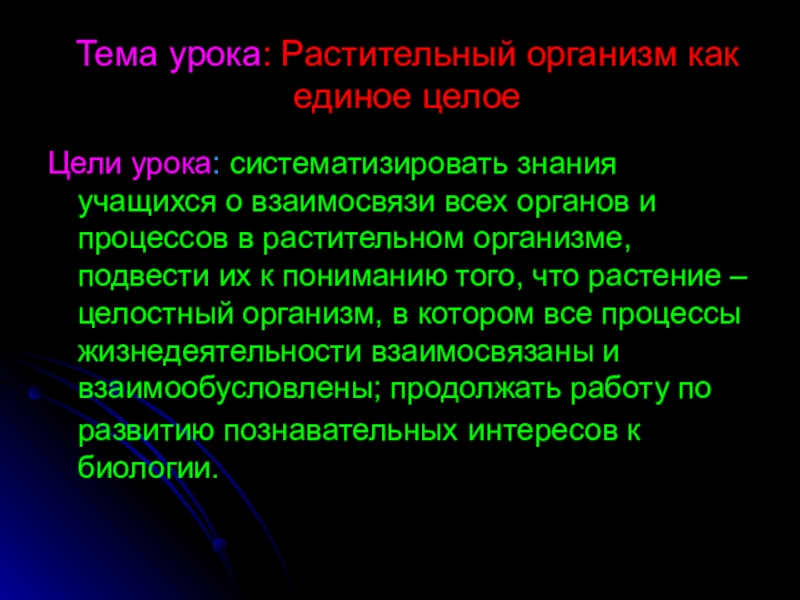 о взаимосвязи всех органов и процессов в растительном организме, подвести их к пониманию того, что растение – целостный организм, в котором все процессы жизнедеятельности взаимосвязаны и взаимообусловлены; продолжать работу по развитию познавательных интересов к биологии.