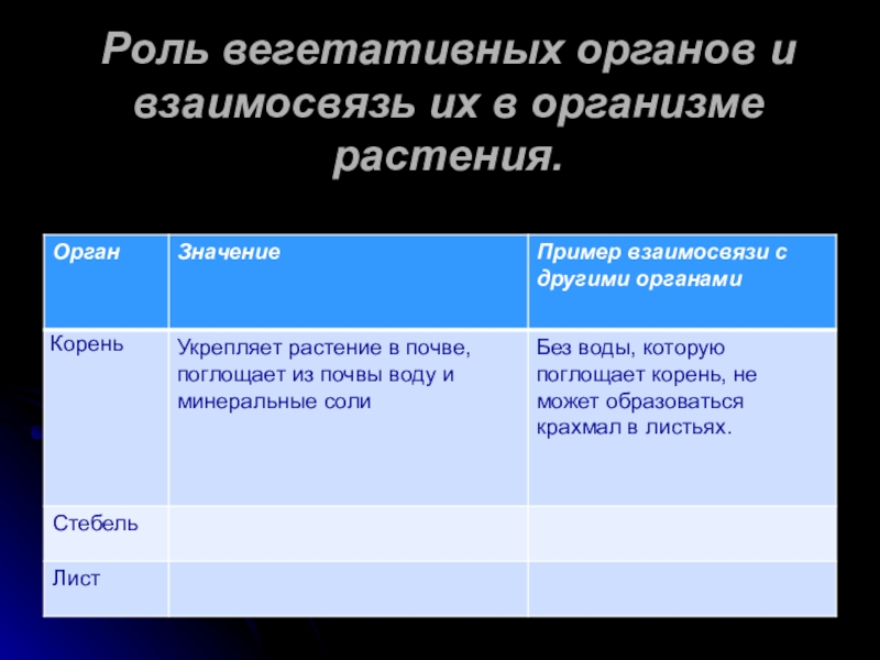 Слайд 15Роль вегетативных органов и взаимосвязь их в организме растения.