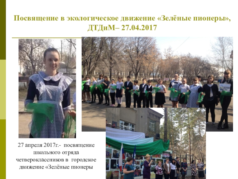 Слайд 2Посвящение в экологическое движение «Зелёные пионеры», ДТДиМ– 27.04.2017