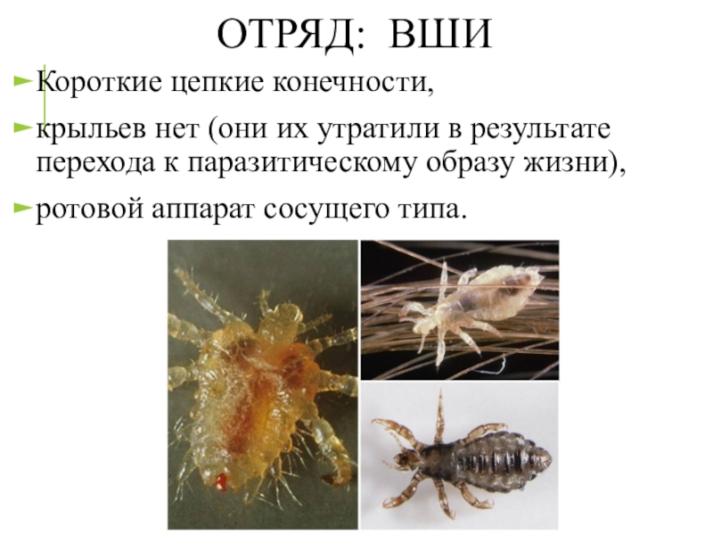 ОТРЯД: ВШИКороткие цепкие конечности, крыльев нет (они их утратили в результате перехода к паразитическому образу жизни),ротовой аппарат