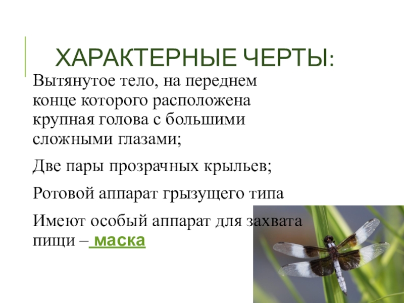 ХАРАКТЕРНЫЕ ЧЕРТЫ:Вытянутое тело, на переднем конце которого расположена крупная голова с большими сложными глазами; Две пары прозрачных крыльев; Ротовой аппарат грызущего типаИмеют особый аппарат для захвата пищи – маска