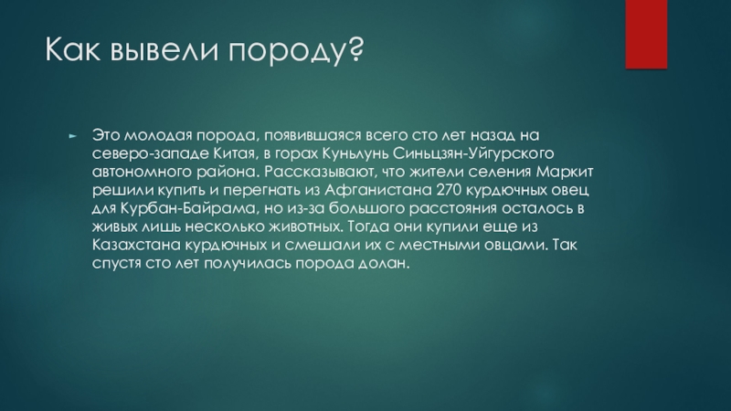 Как вывели породу?Это молодая порода, появившаяся всего сто лет назад на северо-западе Китая, в горах Куньлунь Синьцзян-Уйгурского автономного района. Рассказывают, что жители селения Маркит решили купить и перегнать из Афганистана 270 курдючных овец для Курбан-Байрама, но