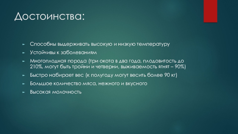 Достоинства: Способны выдерживать высокую и низкую температуруУстойчивы к заболеваниямМногоплодная порода (три окота в два года, плодовитость до