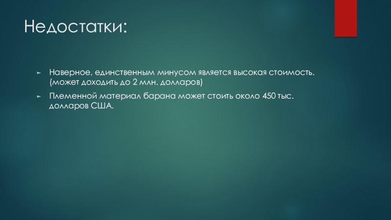 Недостатки:Наверное, единственным минусом является высокая стоимость. (может доходить до 2 млн. долларов)Племенной материал барана может стоить около