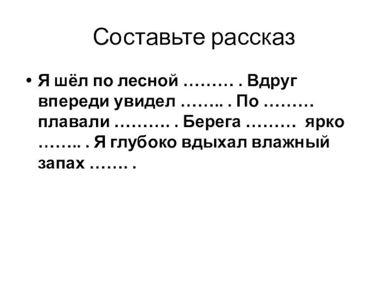 Составьте рассказЯ шёл по лесной ……… . Вдруг впереди увидел …….. . По ……… плавали ………. .
