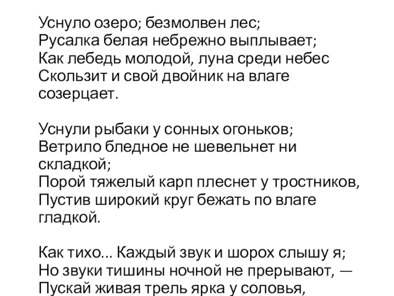 Уснуло озеро; безмолвен лес; Русалка белая небрежно выплывает; Как лебедь молодой, луна среди небес Скользит