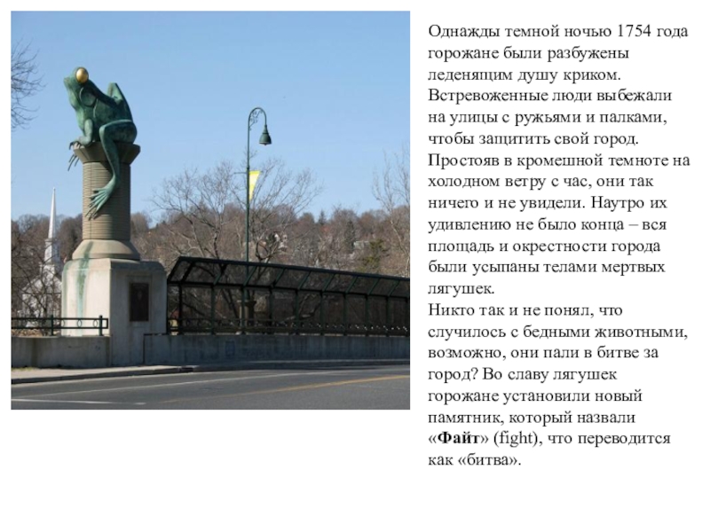 Никто так и не понял, что случилось с бедными животными, возможно, они пали в битве за город? Во славу лягушек горожане установили новый памятник, который назвали «Файт» (fight), что переводится как «битва».