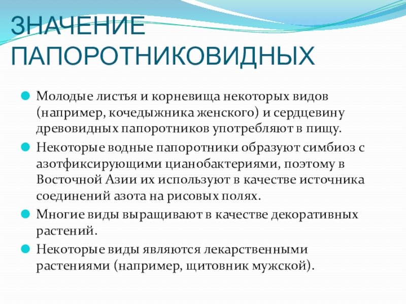 ЗНАЧЕНИЕ ПАПОРОТНИКОВИДНЫХМолодые листья и корневища некоторых видов (например, кочедыжника женского) и сердцевину древовидных папоротников употребляют в пищу.Некоторые