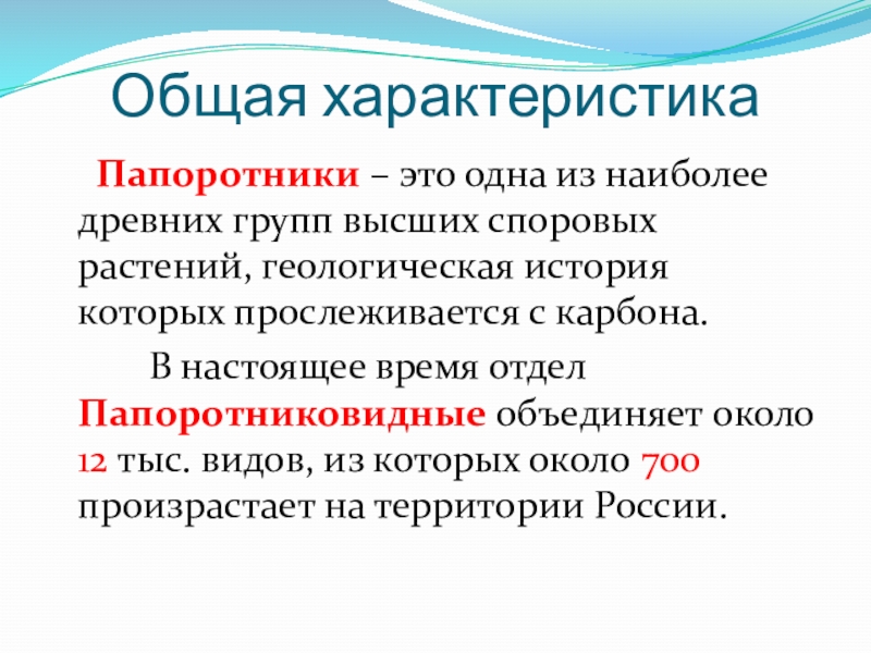 Общая характеристика  	Папоротники – это одна из наиболее древних групп высших споровых растений, геологическая история которых