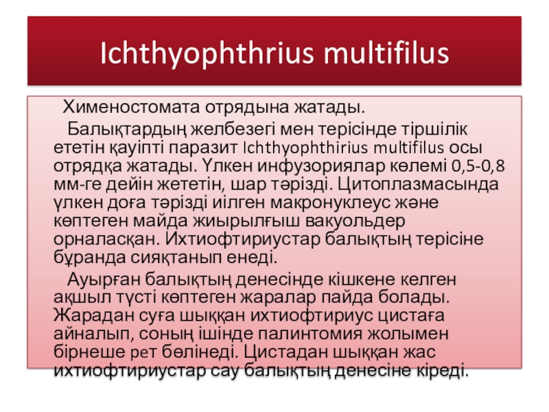Ауырған балықтың денесінде кішкене келген ақшыл түсті көптеген жаралар пайда болады. Жарадан суға шыққан ихтиофтириус цистаға айналып, соның ішінде палинтомия жолымен бірнеше peт бөлінеді. Цистадан шыққан жас ихтиофтириустар сау балықтың денесіне кіреді.