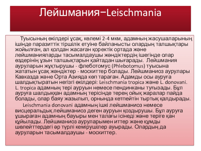 адамның жасушаларының ішінде паразиттік тіршілік етуіне байланысты олардың талшықтары жойылған, ал қолдан жасаған қоректік ортада және лейшманияларды тасымалдаушы жәндіктердің ішегінде олар өздерінің ұзын талшықтарын қайтадан шығарады. Лейшмания ауруларын жұқтырушы - флеботомус (Phlebotomus) туысына жататын ұсақ жәндіктер - москиттер болады. Лейшманиоз аурулары Кавказда және Орта Азияда көп тараған. Адамды осы ауруға шалдықтыратын негізгі өкілдері: Leischmania tropica және L. donovani. L. tropica адамның тері ауруын немесе пендинканы туғызады. Бұл ауруға шалдыққан адамның терісінде терең ойық жаралар пайда болады, олар баяу жазылып, орнында кетпейтін тыртық қалдырады.
