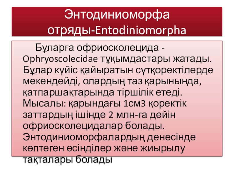 жатады. Бұлар күйіс қайыратын сүтқоректілерде мекендейді, олардың таз қарынында, қатпаршақтарында тіршілік етеді. Мысалы: қарындағы 1см3 қоректік заттардың ішінде 2 млн-ға дейін офриосколецидалар болады. Энтодиниоморфалардың денесінде көптеген өсінділер және жиырылу тақталары болады